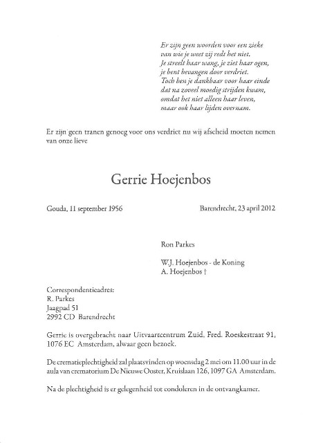 Het is mijn droeve plicht u, namens het bestuur, te moeten mee delen dat onze secretaris Gerrie Hoejenbos afgelopen maandag 23 april op 55 jarige leeftijd is overleden. Veel leden wisten dat ze al geruime tijd ziek was maar daarvan was tot voor kort zeker tijdens onze bestuursbijeenkomsten weinig te merken. Altijd optimistisch en vriendelijk werden we bij haar ontvangen voor de vergaderingen en tot voor kort ook altijd nog bezig voor haar HCA tot haar krachten de afgelopen weken duidelijk afnamen.
