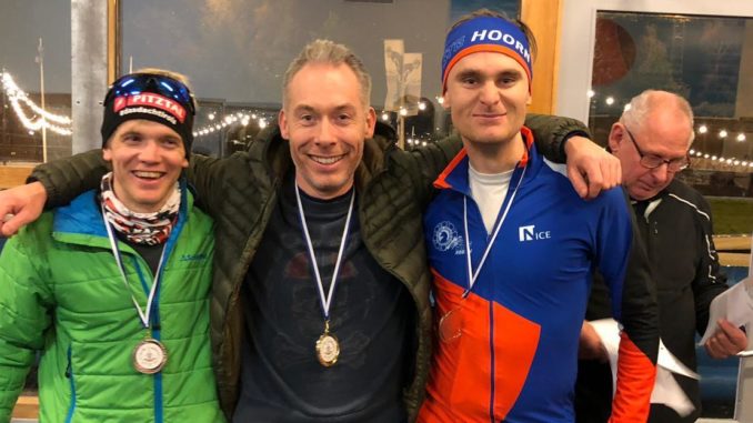 Ik trek snel al mijn kleren weer aan en ga meteen de kleedkamer in. Warm worden. Na de dweil begint de 1.000m. Die duurt even en dan wordt er weer gedweild. Dat is eigenlijk niet nodig. Na de dweil neem ik me voor om nu echt laat op het ijs te staan. Ik zit in rit 70 en stap bij rit 62 het ijs op. Toch net iets te vroeg. Na wat inrijden en met lichte tegenzin sta ik aan de start in de allerlaatste rit van de avond. Dit keer ben ik gelukkig in één keer weg. Ik open in 27.99wat vrij treurig is, maar daarvan geef ik de wind lekker de schuld. Dan volgt een ronde 31.9. De volgende ronde is dramatisch met 34.3,maar ik zie aan de rondetijden van de anderen dat iedereen het zwaar heeft. De wind zit iedereen dwars. De omstandigheden zijn in ieder geval eerlijk in ons kwartet. Onderweg zie ik niets van mijn tegenstander, maar tegen het einde doemt wel mede HCA’er Rogier voor mij op. Rogier zat in rit 69 in hetzelfde kwartet als ik en vormt een mooi richtpunt. In de laatste bocht passeer ik hem en kom ik in 2.09.30over de finish. Gesloopt. Deze was echt zwaar. Maar tot mijn vreugde zie ik dat mijn tegenstander van de 500m 2.09.96klokt. Dat betekent dus dat ik het klassement gewonnen heb! Misschien heeft Daniëlle dan toch gelijk en is dit mijn weer…