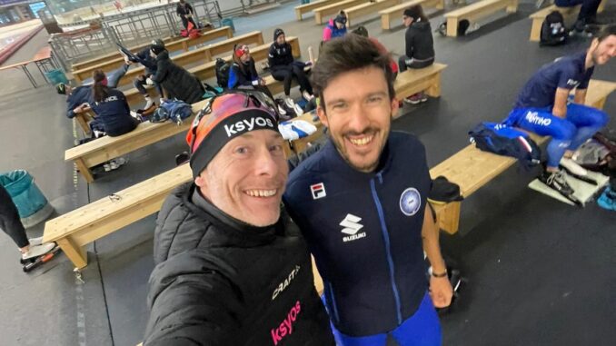 Deze keer was er geen wedstrijd, dus die rijd ik morgen in Leeuwarden. De foto was wel met een Italiaan, maar een andere dit keer. De lieve, goedlachse en ongelooflijk bescheiden Davide Ghiotto haalde ons met zijn makkers drie keer in tijdens onze 16 duurrondjes. De blauwe trein manoeuvreerde kundig om ons heen. Na afloop een compliment, een foto en veel plezier.