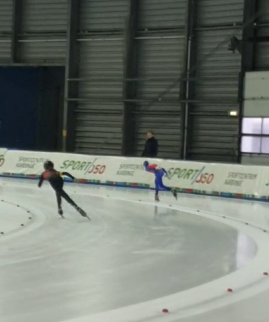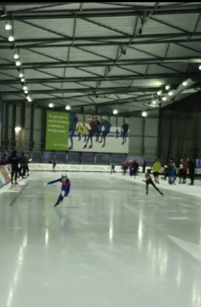 Het is een eind rijden, maar dan heb je ook wat. Een droge ijsbaan, terwijl het buiten behoorlijk aan het regenen en waaien was. Wij als ‘buitenschaatsers’ uit Amsterdam kunnen dat wel waarderen. Grappig om dan naast je in de kleedkamer schaatsers uit Heerenveen te horen klagen over de ijskwaliteit in Groningen.