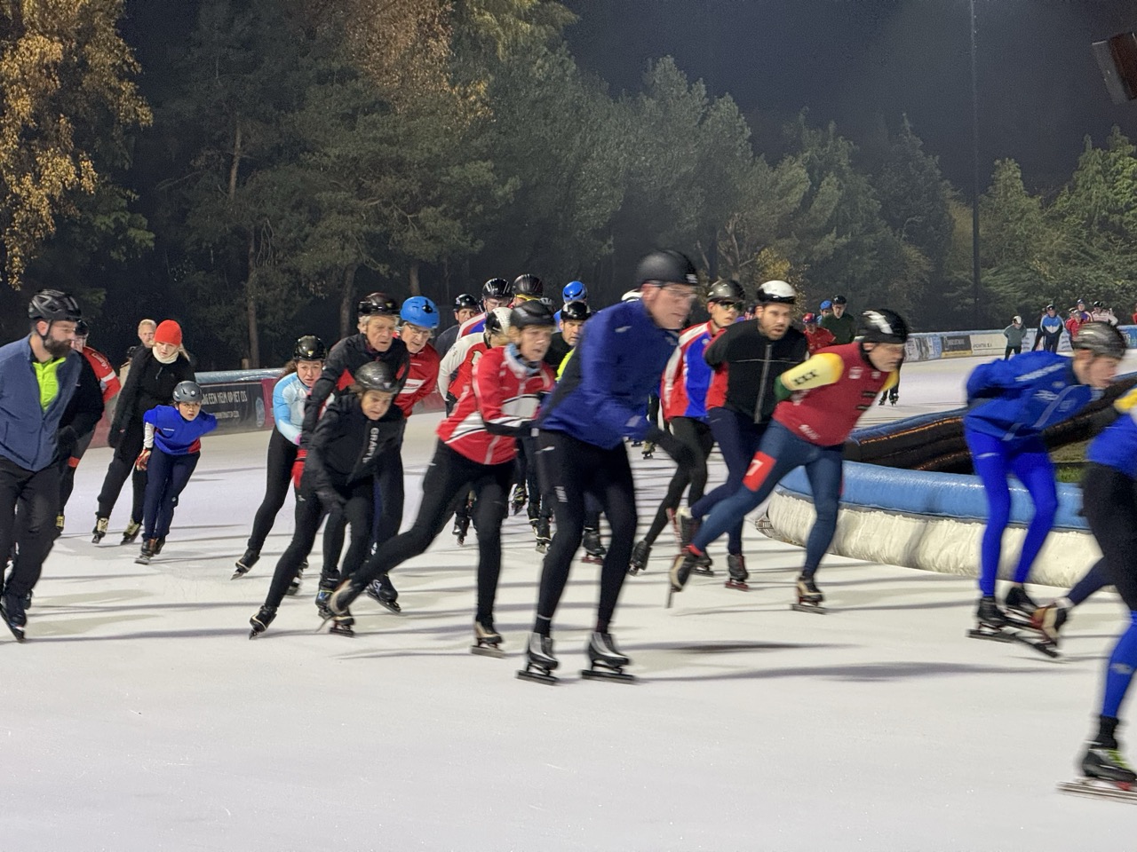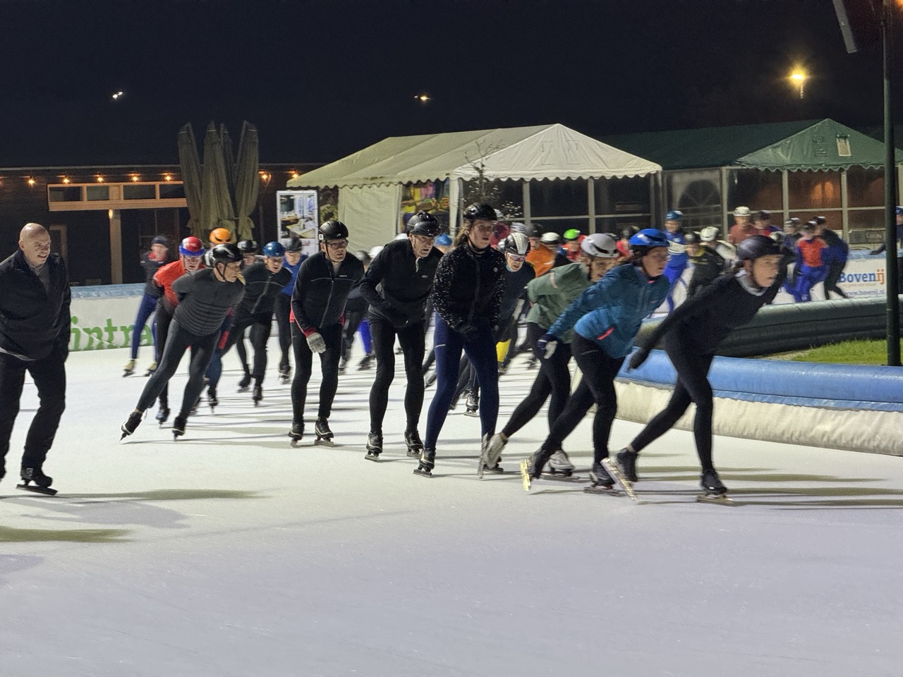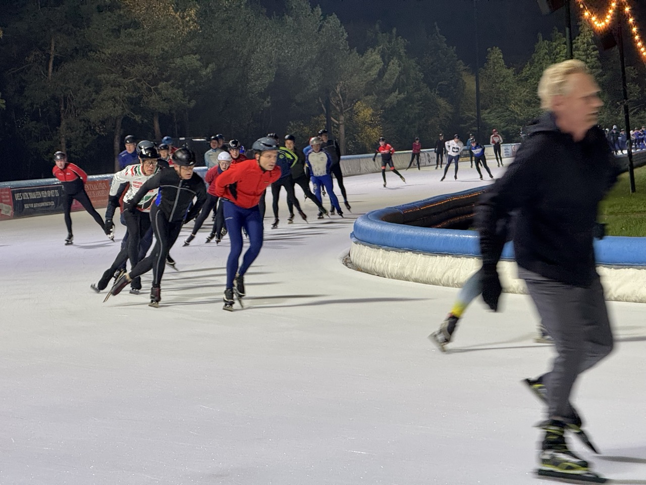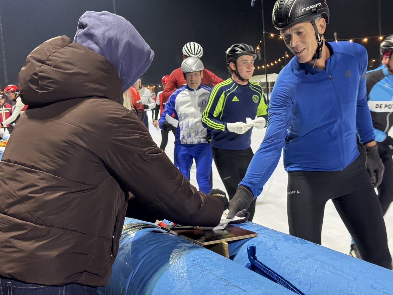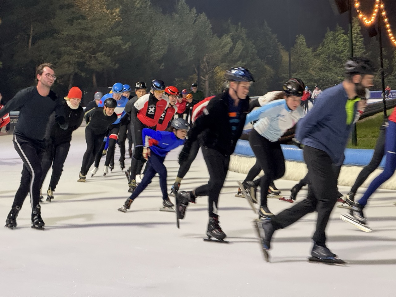Zodoende stonden er om 21.11 uur ongeveer 200 deelnemers te trappelen om te starten, die na de stempelkaart controle het ijs op mochten. De start begon een paar minuten later dan gepland, omdat de ijsmachines nog niet klaar waren met de extra dweil in de beperkte tijd tussen het trainingsuur en de start. Dat bracht de deelnemers niet van hun stuk, want die hadden er zin om hun ronden te gaan rijden op deze mooie droge avond.