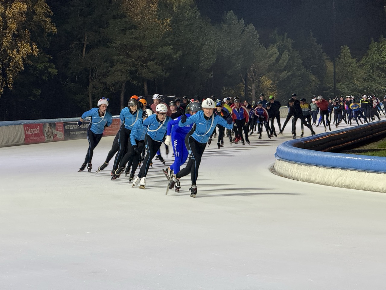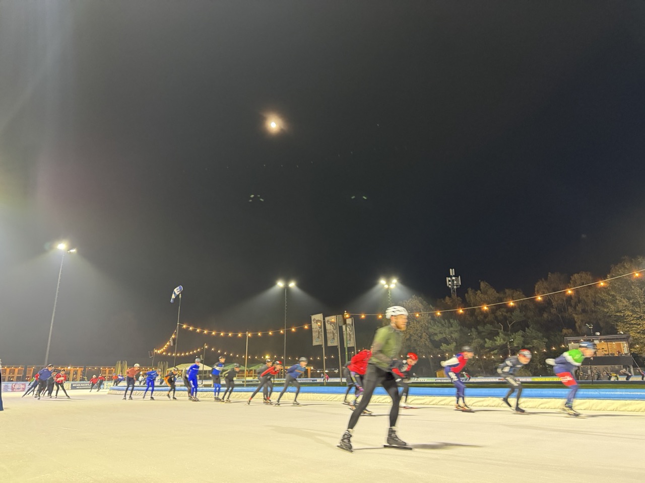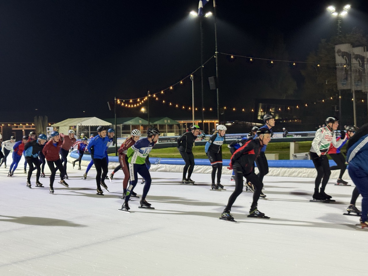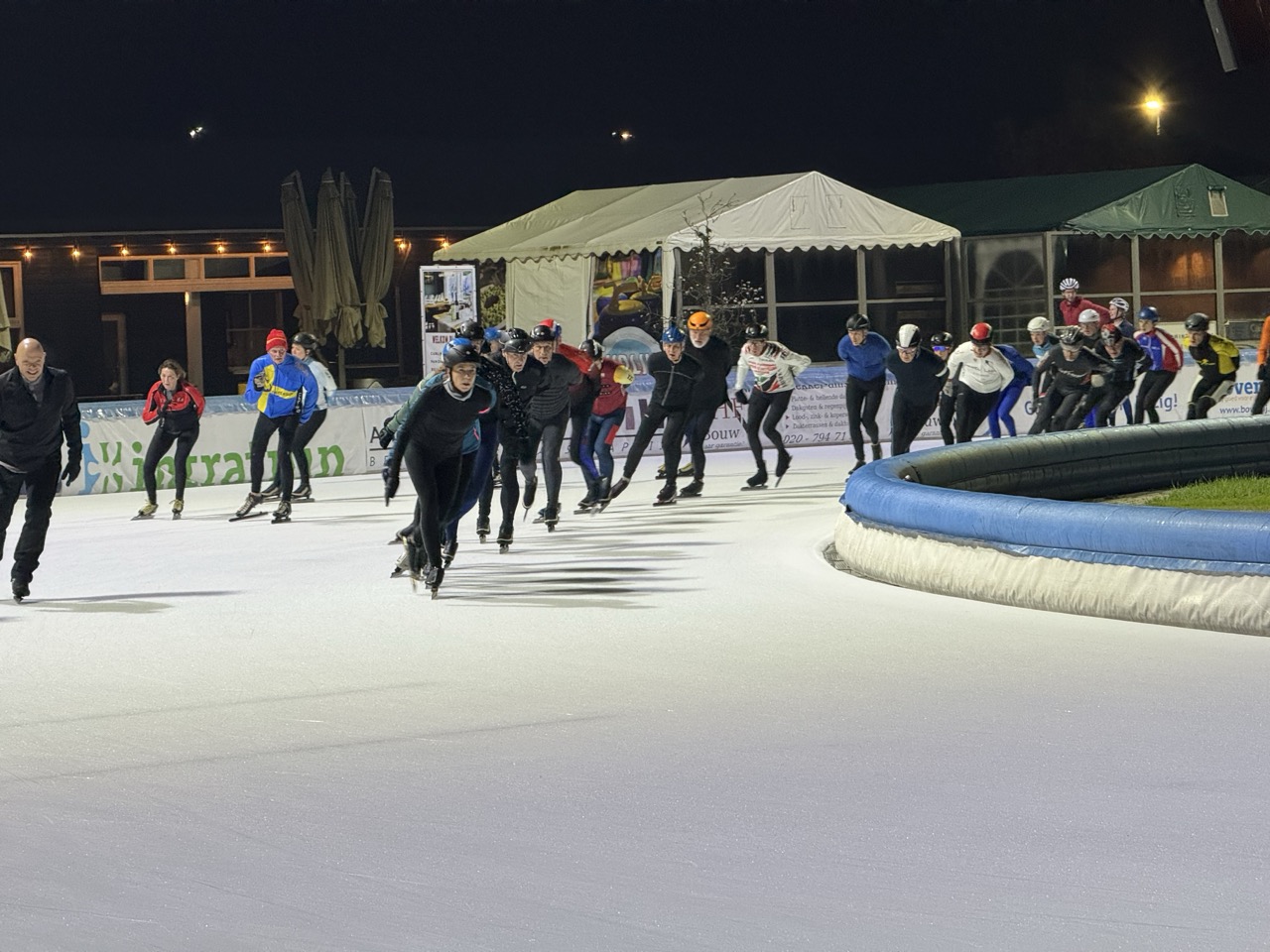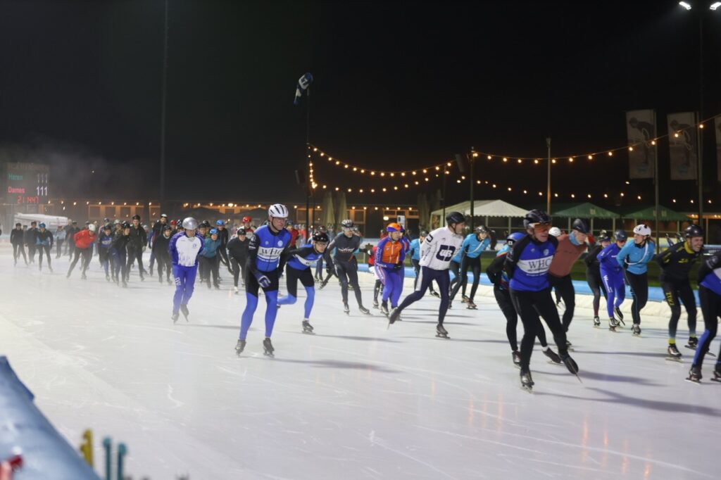 Zodoende stonden er om 21.11 uur ongeveer 200 deelnemers te trappelen om te starten, die na de stempelkaart controle het ijs op mochten. De start begon een paar minuten later dan gepland, omdat de ijsmachines nog niet klaar waren met de extra dweil in de beperkte tijd tussen het trainingsuur en de start. Dat bracht de deelnemers niet van hun stuk, want die hadden er zin om hun ronden te gaan rijden op deze mooie droge avond.