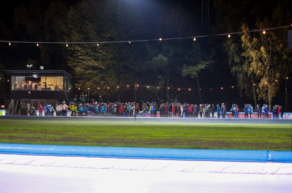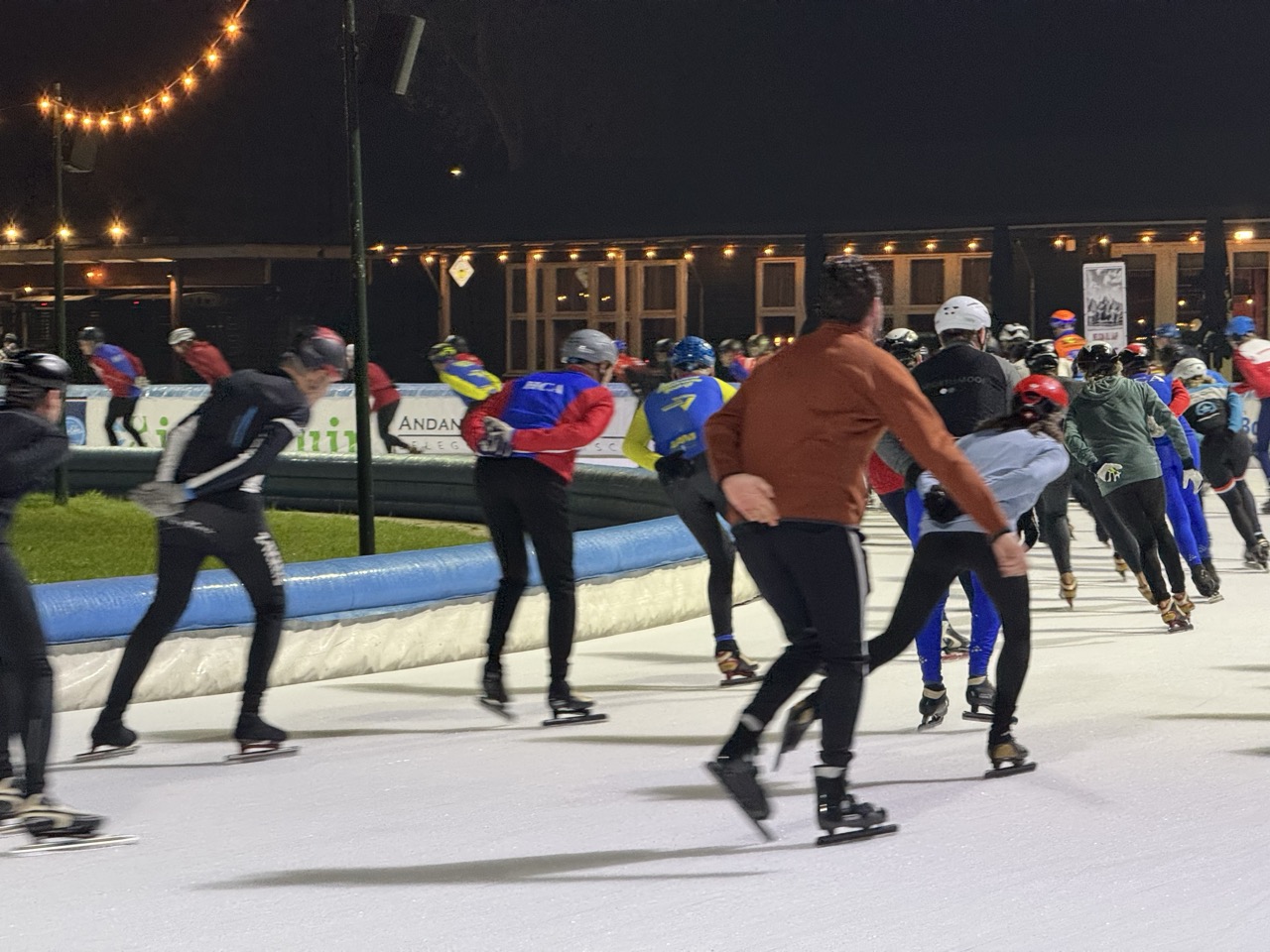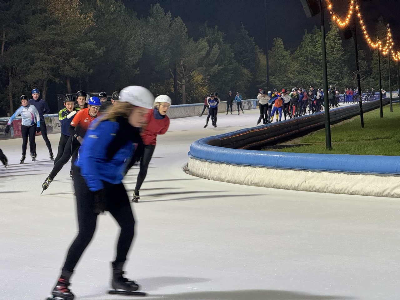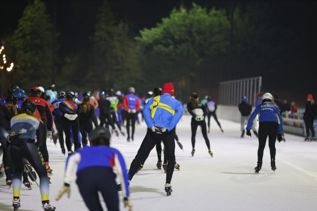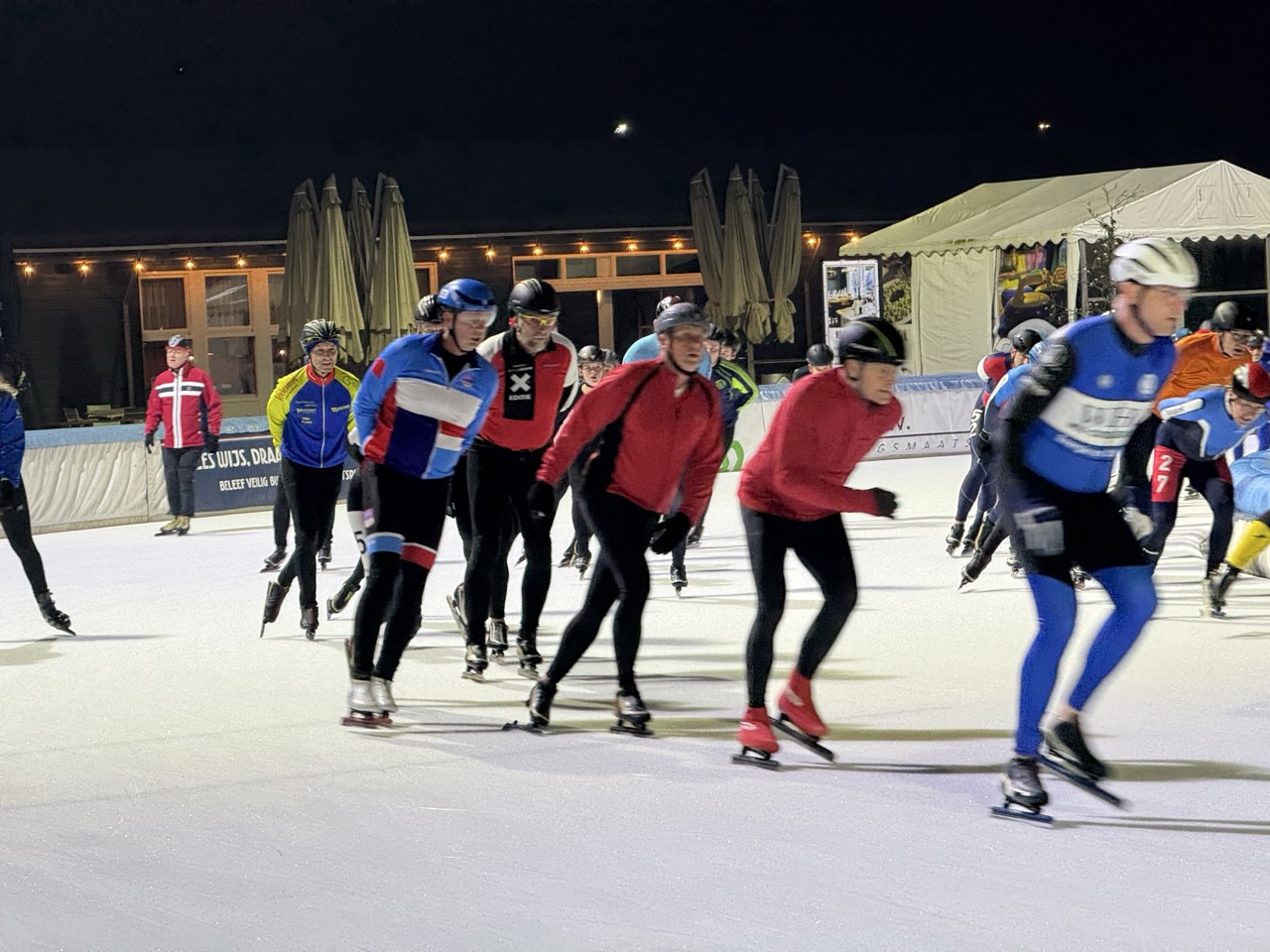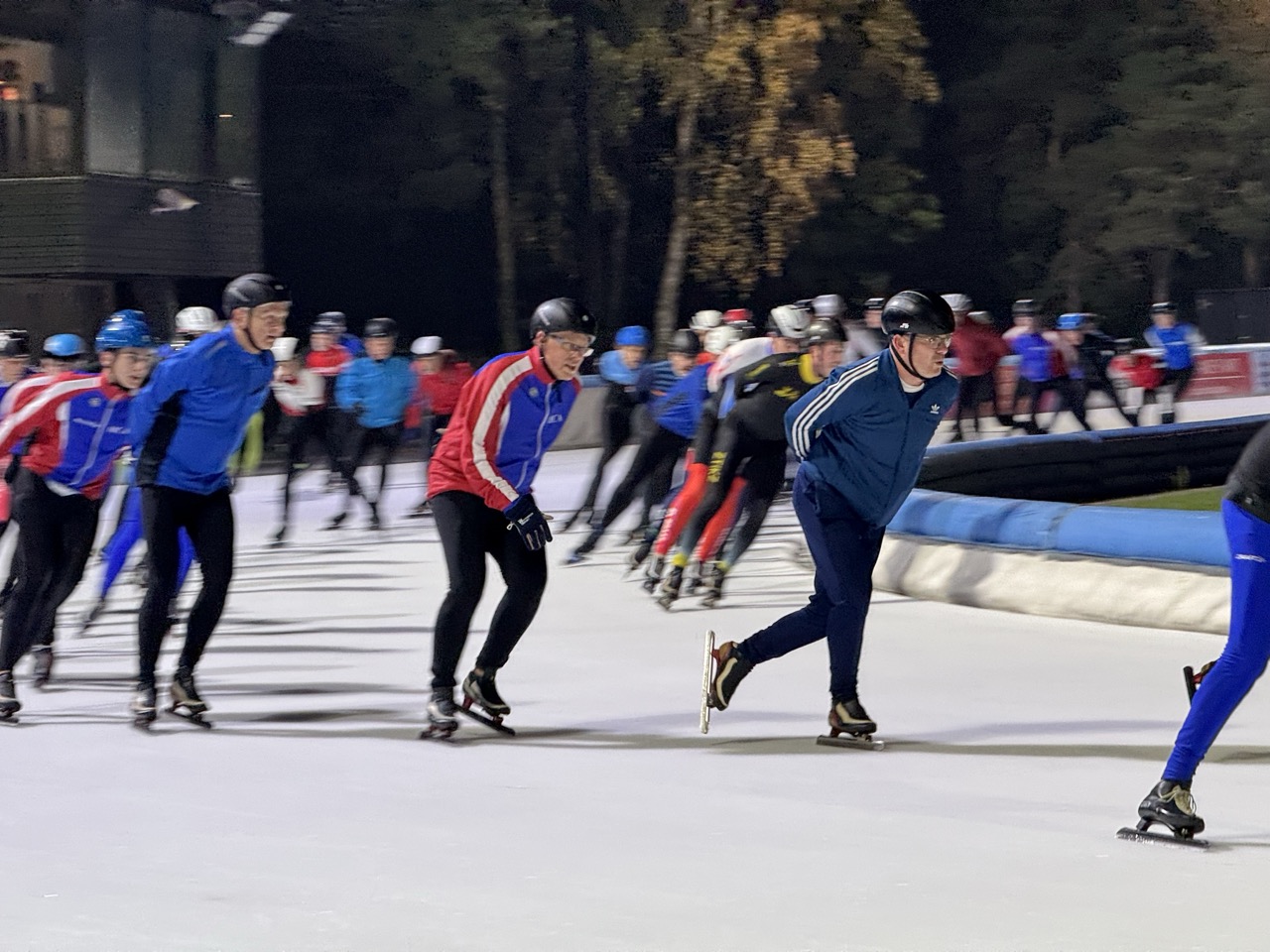 Zodoende stonden er om 21.11 uur ongeveer 200 deelnemers te trappelen om te starten, die na de stempelkaart controle het ijs op mochten. De start begon een paar minuten later dan gepland, omdat de ijsmachines nog niet klaar waren met de extra dweil in de beperkte tijd tussen het trainingsuur en de start. Dat bracht de deelnemers niet van hun stuk, want die hadden er zin om hun ronden te gaan rijden op deze mooie droge avond.