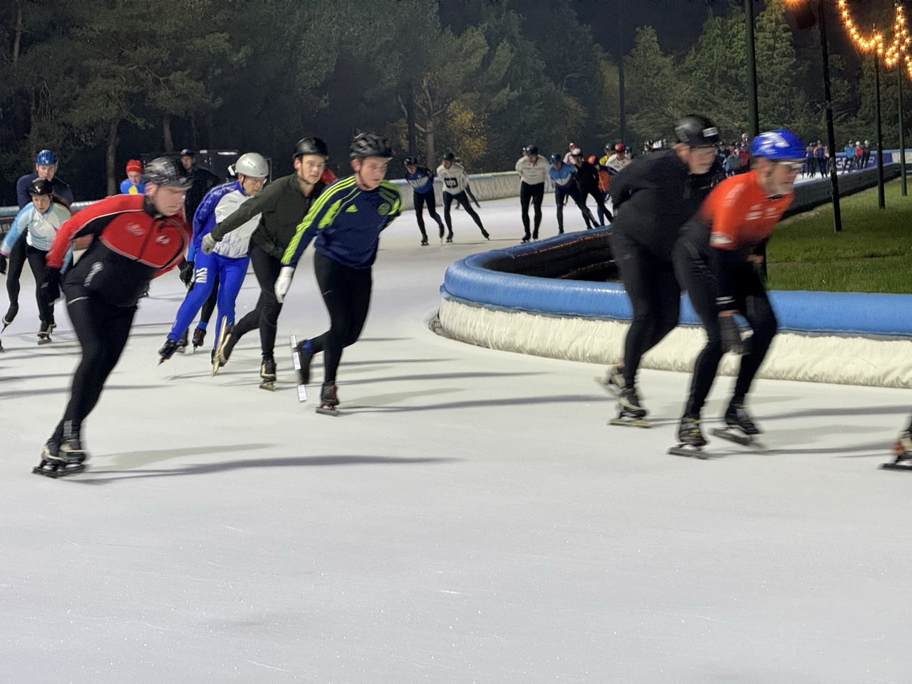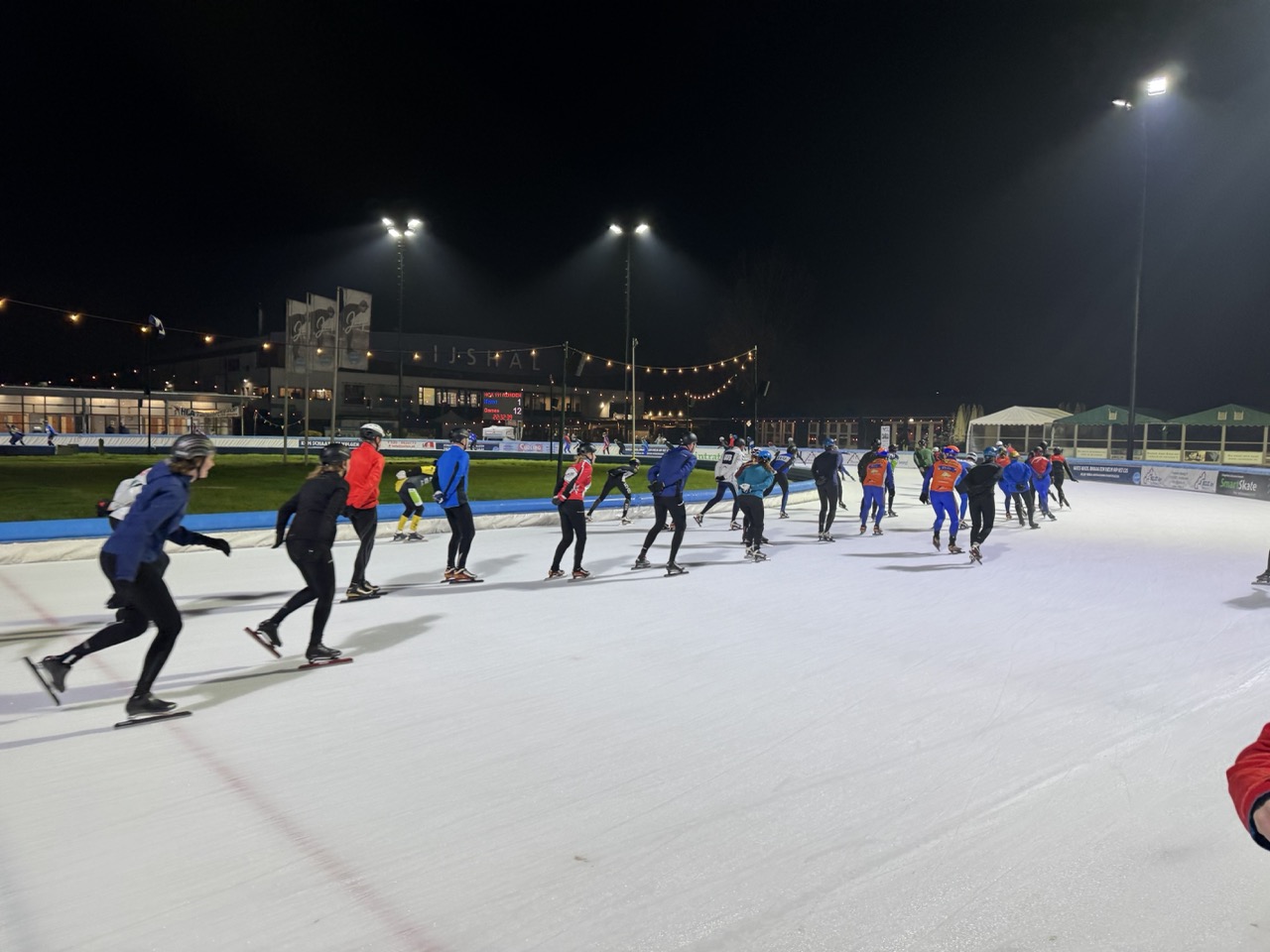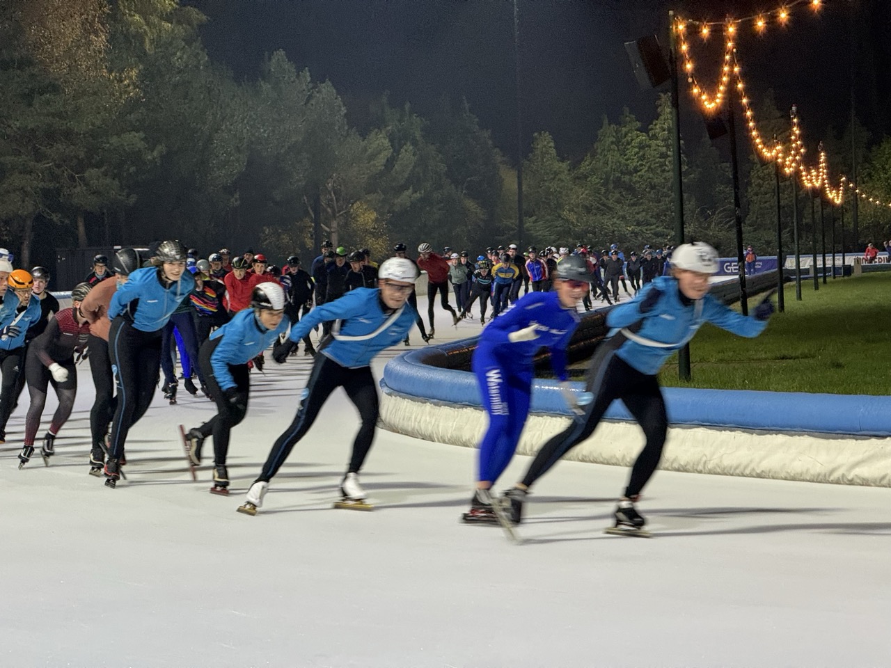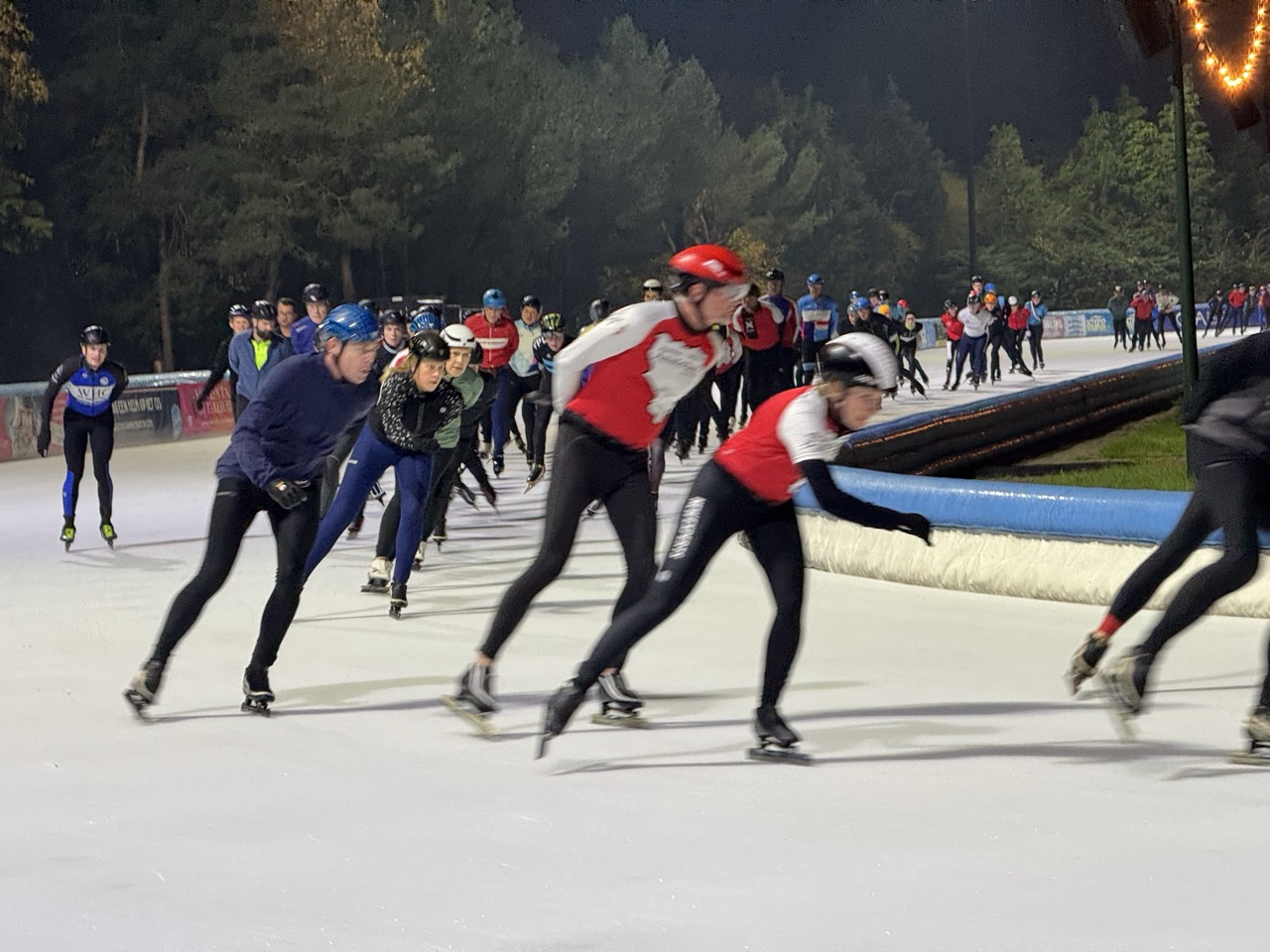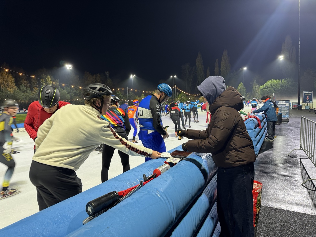 Zodoende stonden er om 21.11 uur ongeveer 200 deelnemers te trappelen om te starten, die na de stempelkaart controle het ijs op mochten. De start begon een paar minuten later dan gepland, omdat de ijsmachines nog niet klaar waren met de extra dweil in de beperkte tijd tussen het trainingsuur en de start. Dat bracht de deelnemers niet van hun stuk, want die hadden er zin om hun ronden te gaan rijden op deze mooie droge avond.