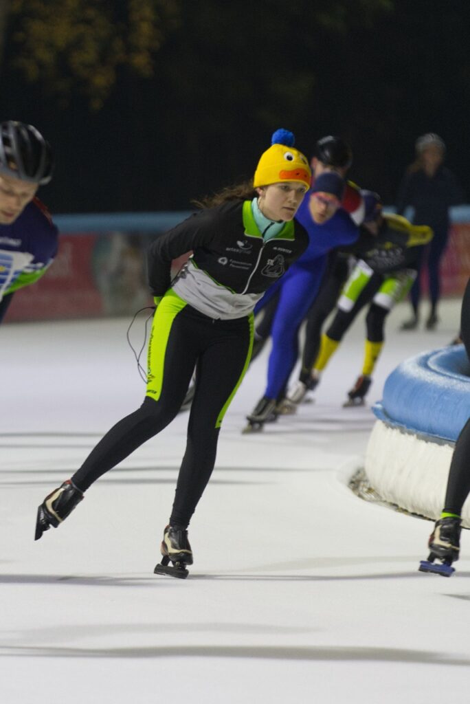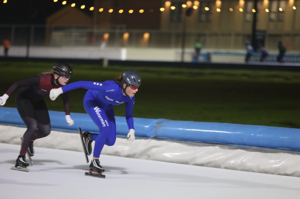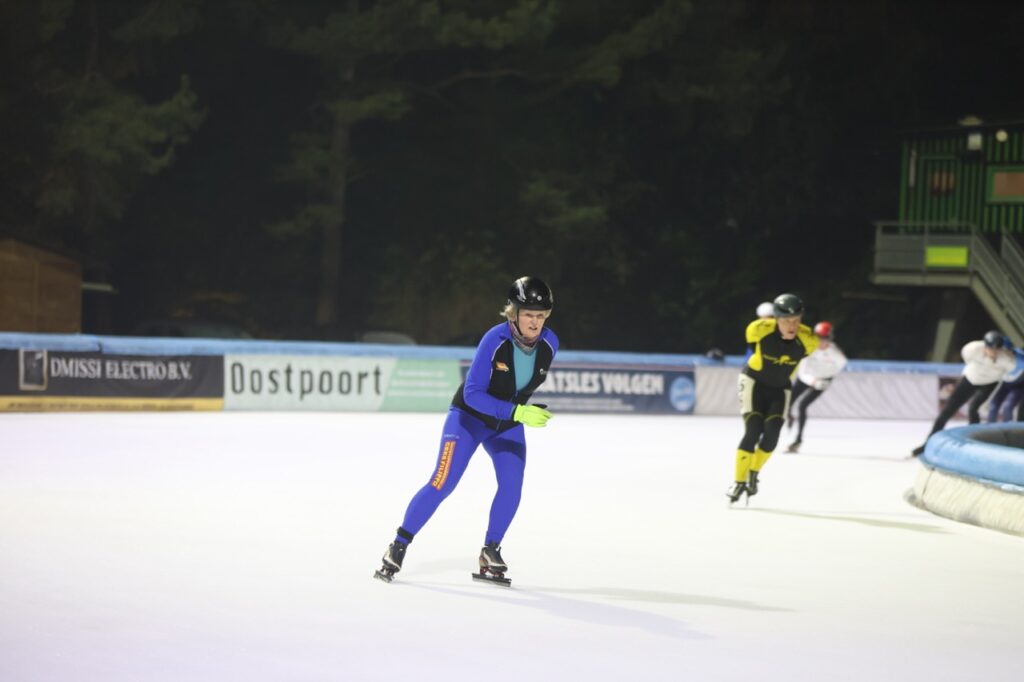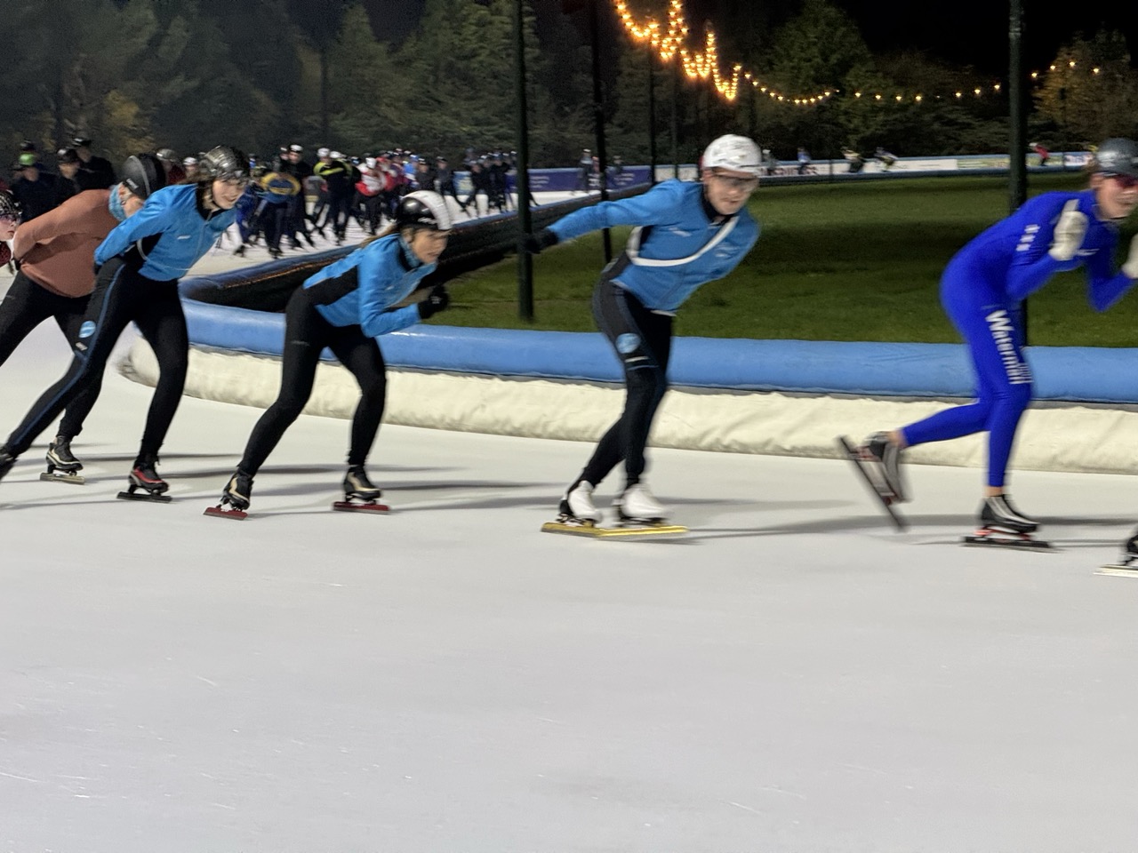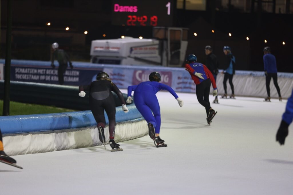 De dames hadden toen nog 20 ronden te gaan, waarbij ze bij de laatste ronde de eindsprint, vanuit de schaatsschool groep, aangingen. Bij het ingaan van de laatste bocht had Tara Hansen, Fien van Hal gelost en kwam Tara Hansen (HGI) als eerste solo over de finish en werd Fien van Hal (HCA) verdienstelijk tweede.