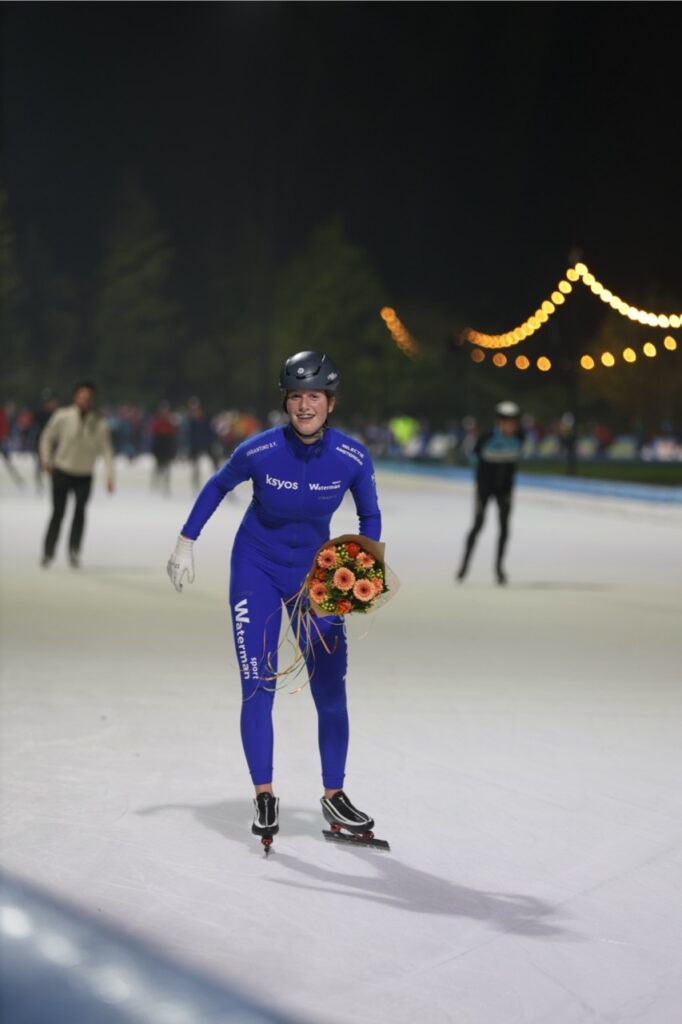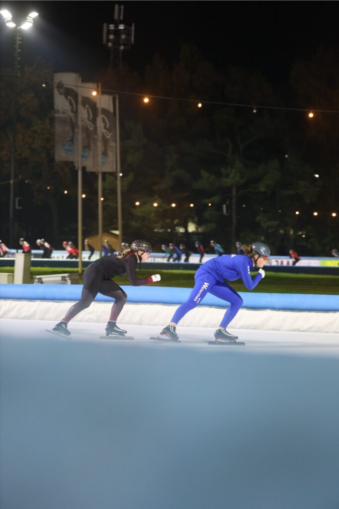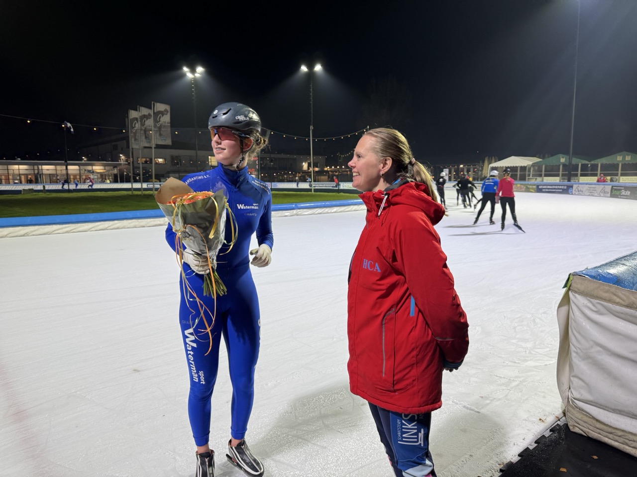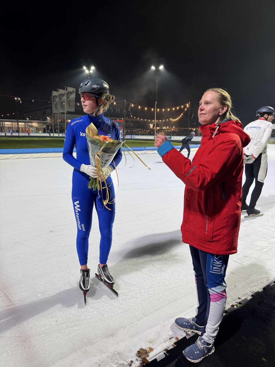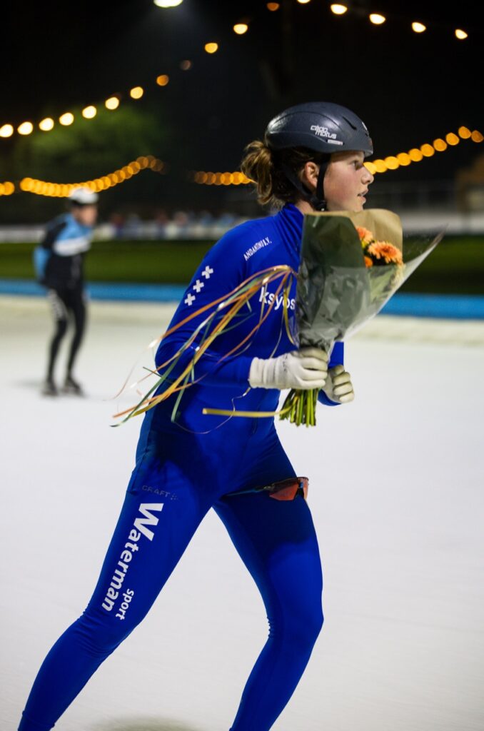 De dames hadden toen nog 20 ronden te gaan, waarbij ze bij de laatste ronde de eindsprint, vanuit de schaatsschool groep, aangingen. Bij het ingaan van de laatste bocht had Tara Hansen, Fien van Hal gelost en kwam Tara Hansen (HGI) als eerste solo over de finish en werd Fien van Hal (HCA) verdienstelijk tweede.