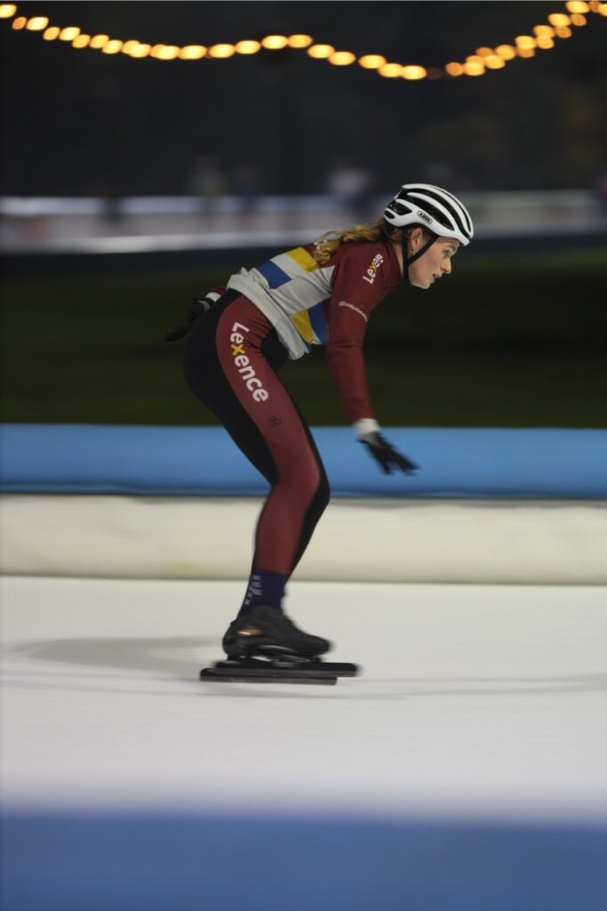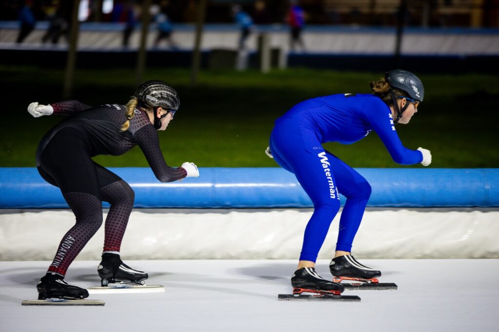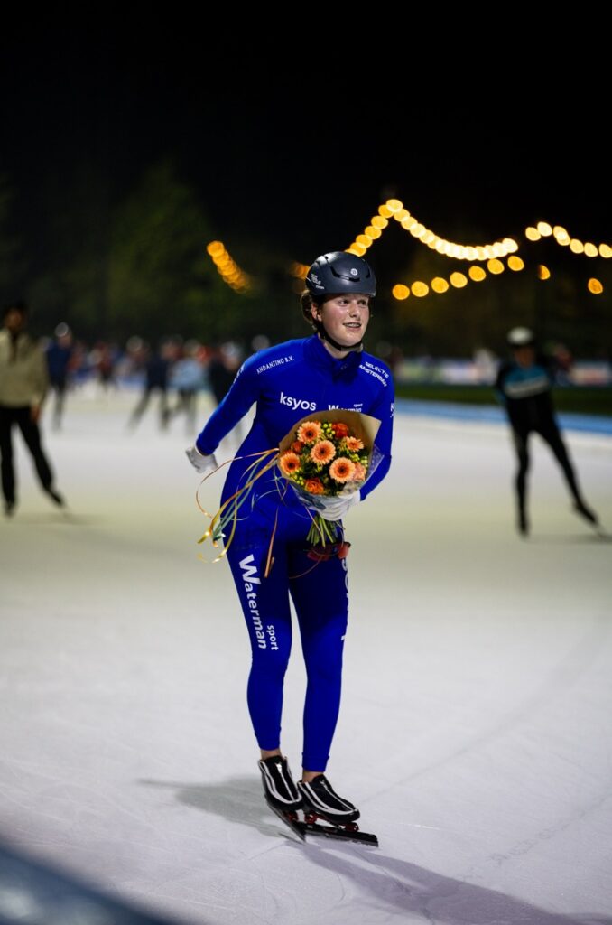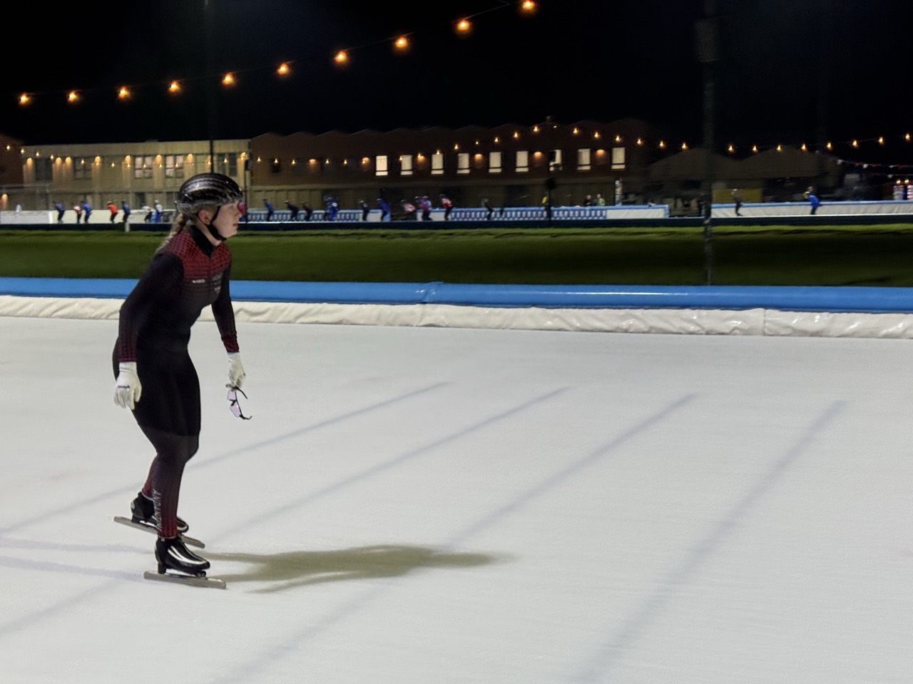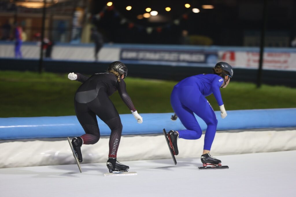 De dames hadden toen nog 20 ronden te gaan, waarbij ze bij de laatste ronde de eindsprint, vanuit de schaatsschool groep, aangingen. Bij het ingaan van de laatste bocht had Tara Hansen, Fien van Hal gelost en kwam Tara Hansen (HGI) als eerste solo over de finish en werd Fien van Hal (HCA) verdienstelijk tweede.