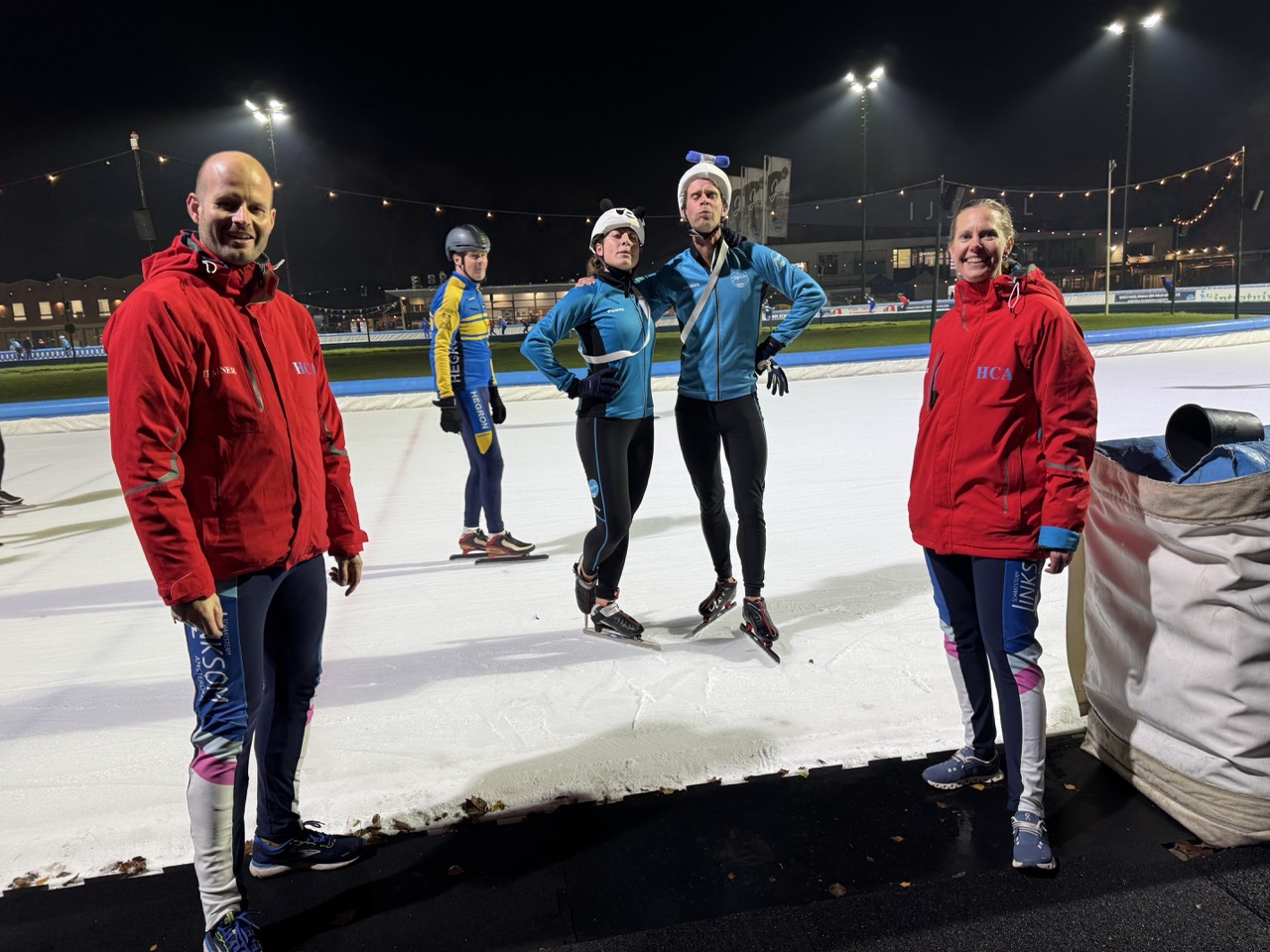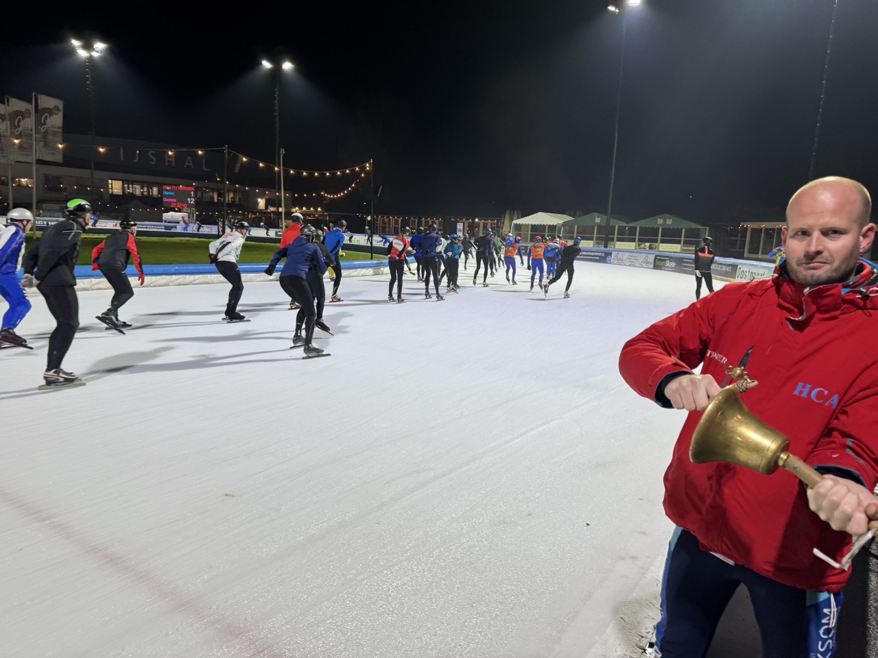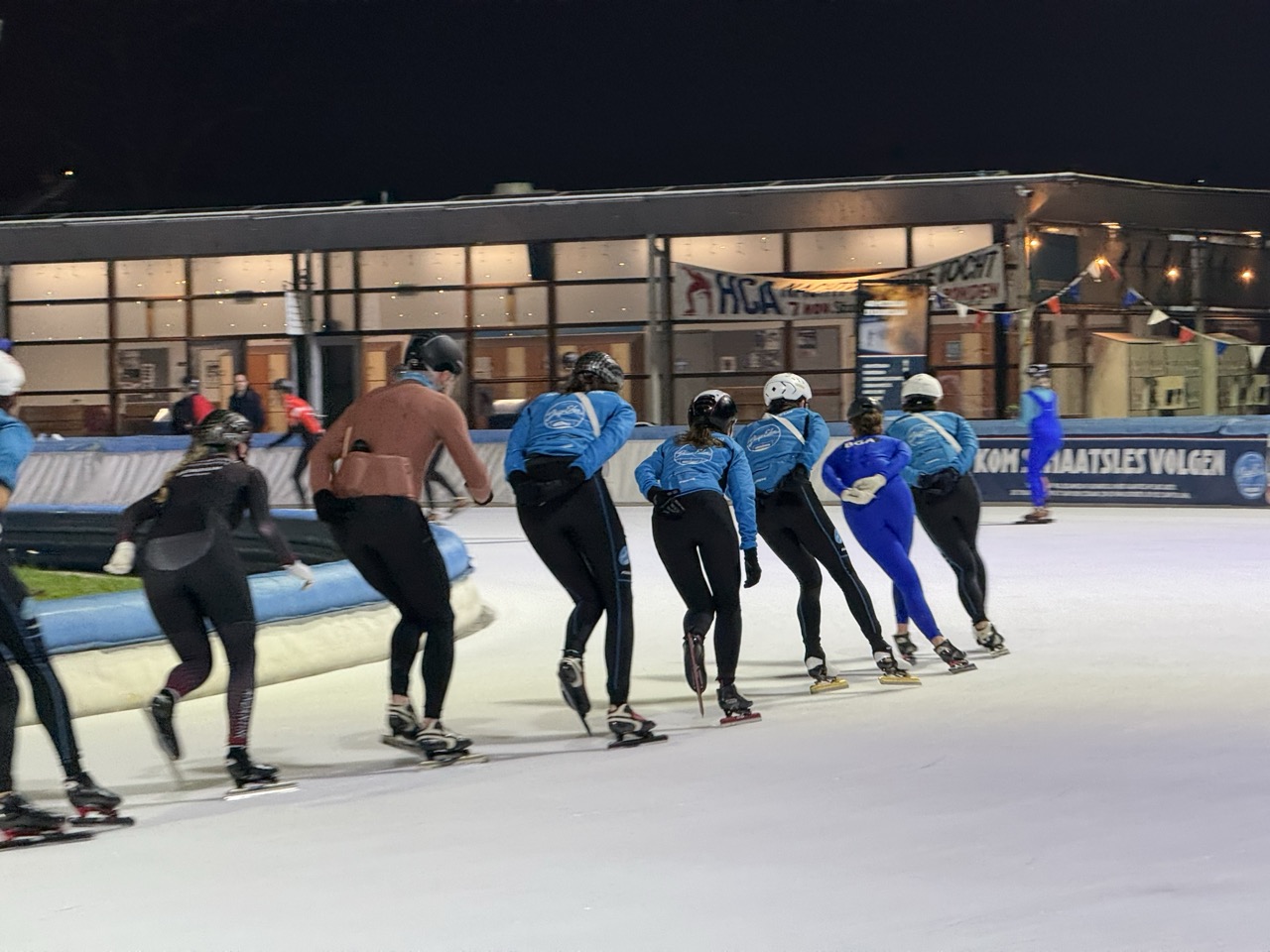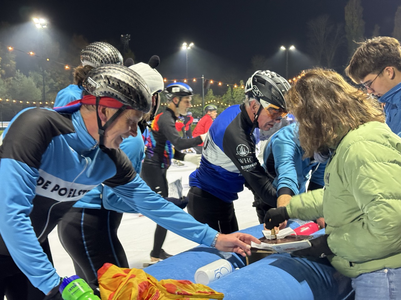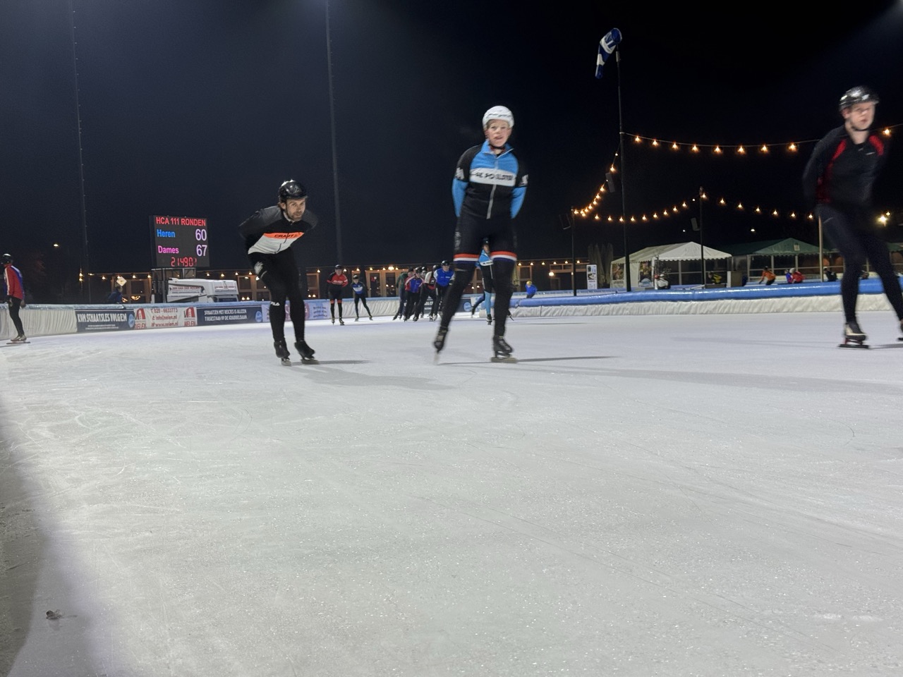 Na de tweede stempelpost op 33 ronden hadden de dames een korte stop, maar konden ze een aantal ronden aansluiten bij de kopgroep van de heren. Dat maakt het voor de rondetellers overzichtelijk. Toch lag het tempo van de heren iets hoger, en verloren ze de aansluiting. Gelukkig werden de dames opgevangen in de groep van de schaatsschool. Met nog 2 ronden te gaan voor de heren ging Niels Siemons demarreren en kwam hij uiteindelijk als eerste solo over de finish. Rutger Beekman en Roel Gremmer gingen daarna sprinten om respectievelijk plek 2 en 3, met als gevolg een volledig HCA podium. Na de finish, een mooie bos bloemen voor de winnaar en de nodige fotosessies met de drie heren, hebben zij hun prestatietocht met trots volbracht.