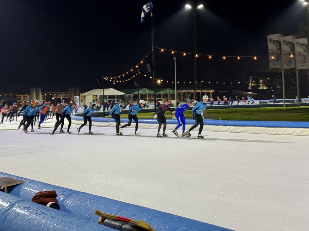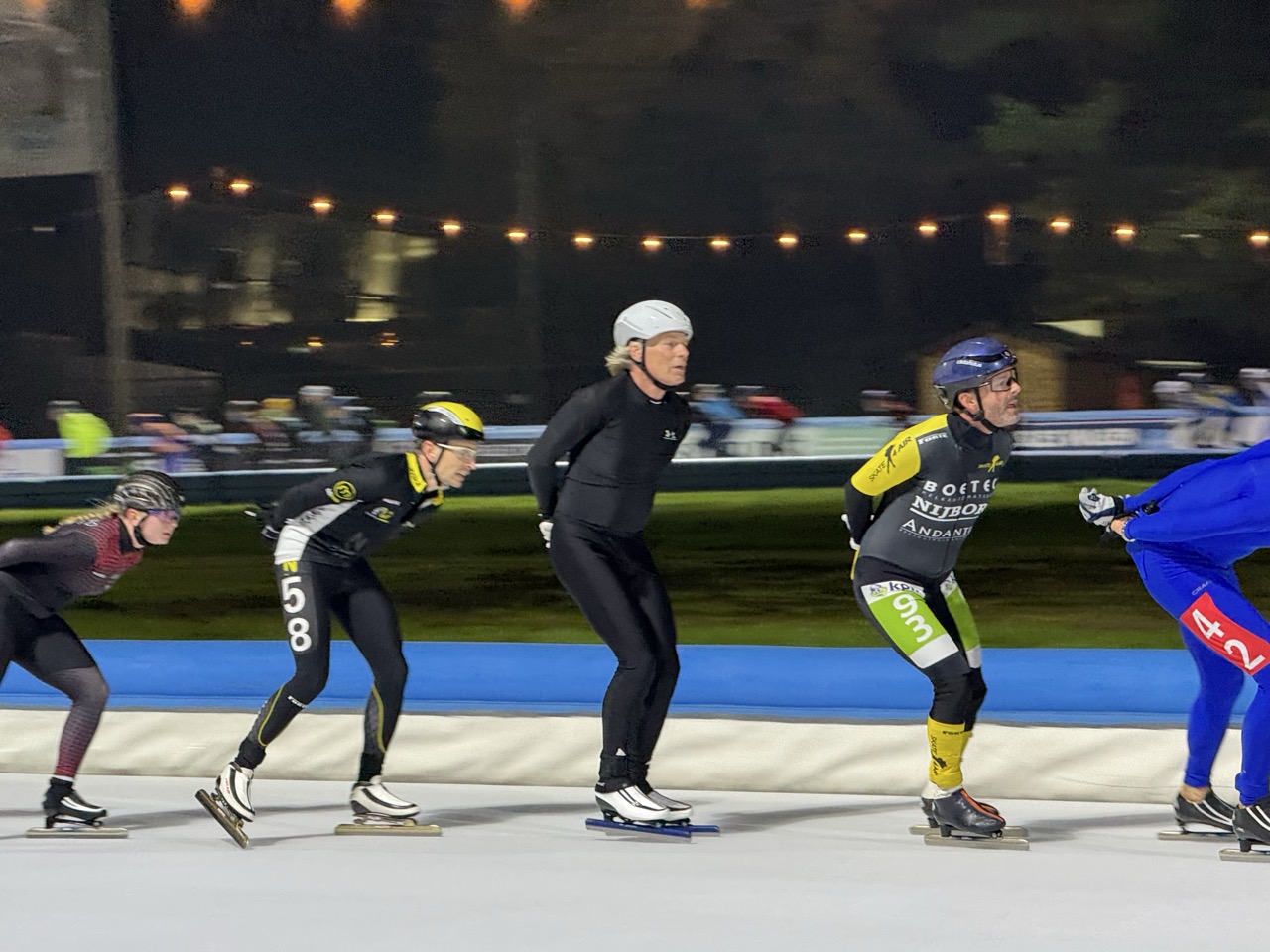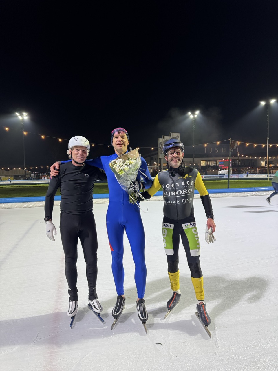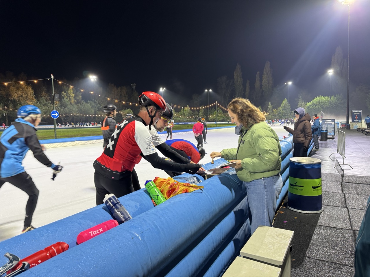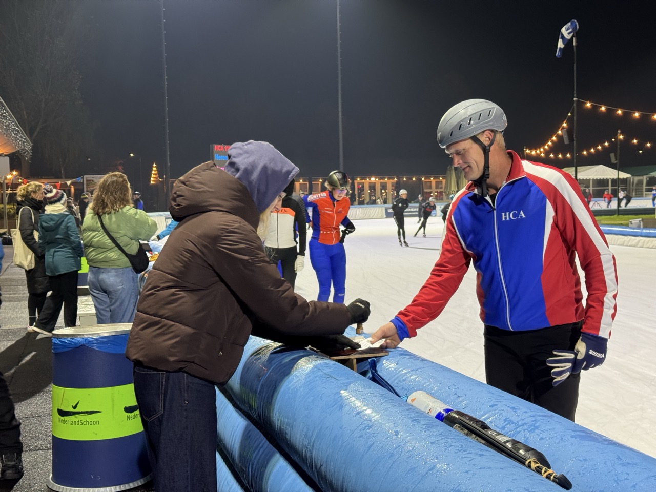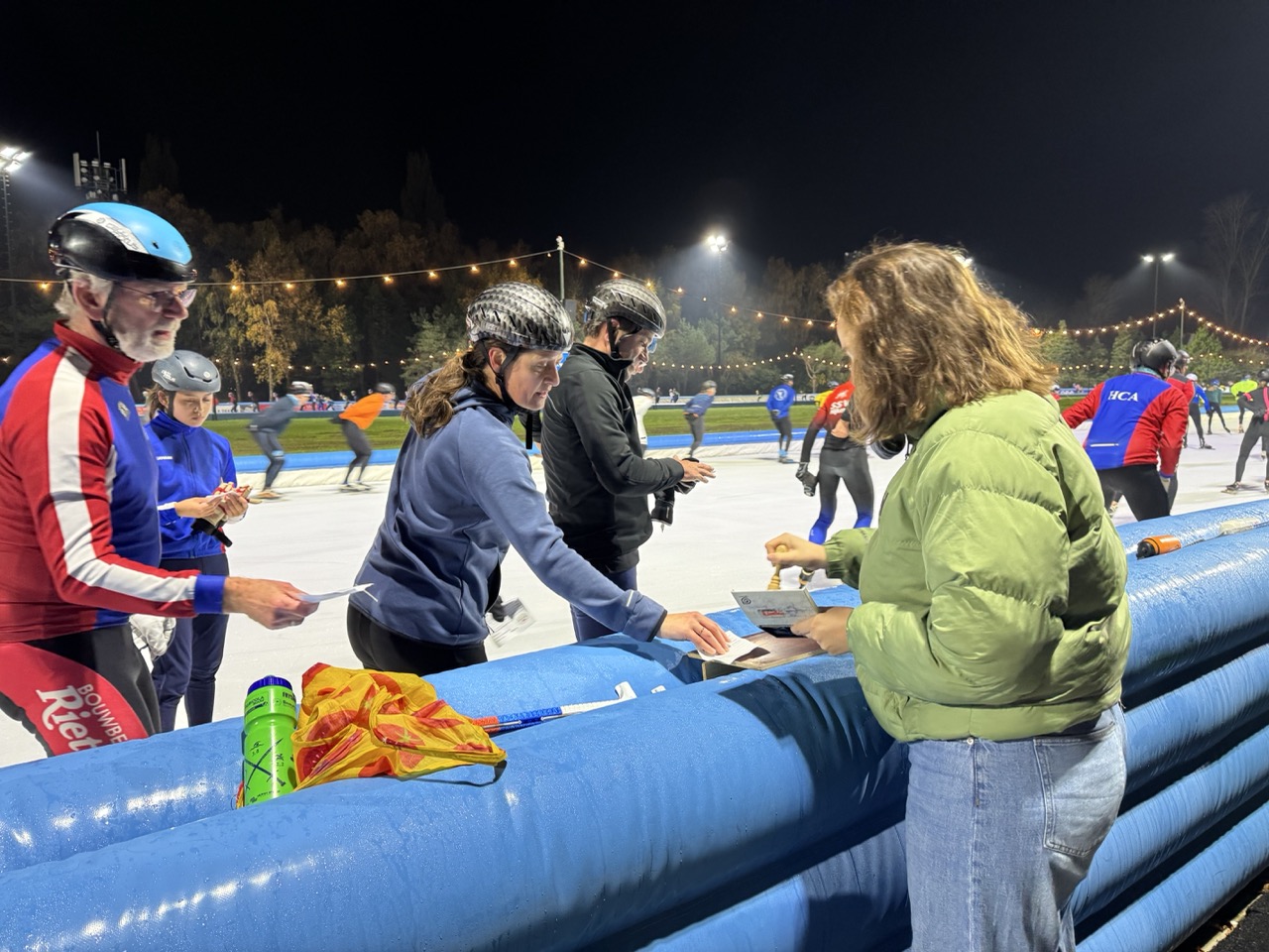 Na de tweede stempelpost op 33 ronden hadden de dames een korte stop, maar konden ze een aantal ronden aansluiten bij de kopgroep van de heren. Dat maakt het voor de rondetellers overzichtelijk. Toch lag het tempo van de heren iets hoger, en verloren ze de aansluiting. Gelukkig werden de dames opgevangen in de groep van de schaatsschool. Met nog 2 ronden te gaan voor de heren ging Niels Siemons demarreren en kwam hij uiteindelijk als eerste solo over de finish. Rutger Beekman en Roel Gremmer gingen daarna sprinten om respectievelijk plek 2 en 3, met als gevolg een volledig HCA podium. Na de finish, een mooie bos bloemen voor de winnaar en de nodige fotosessies met de drie heren, hebben zij hun prestatietocht met trots volbracht.