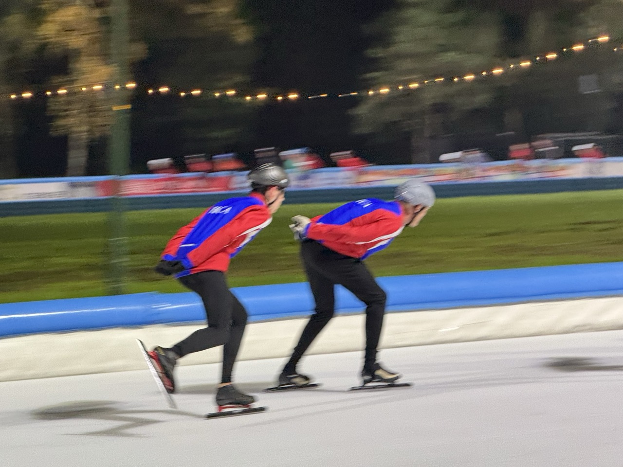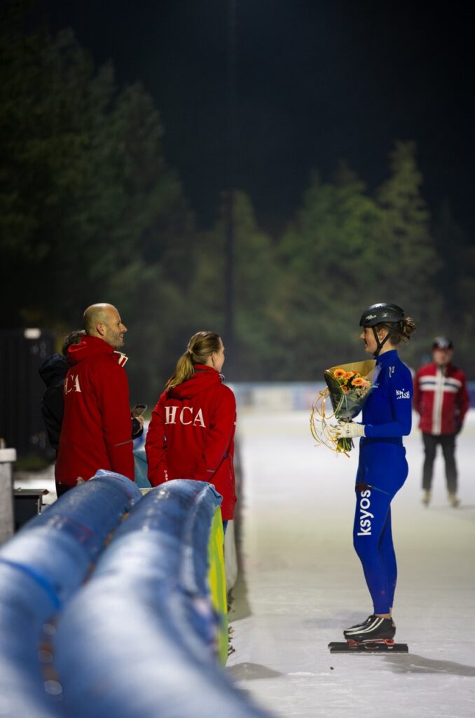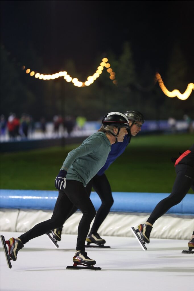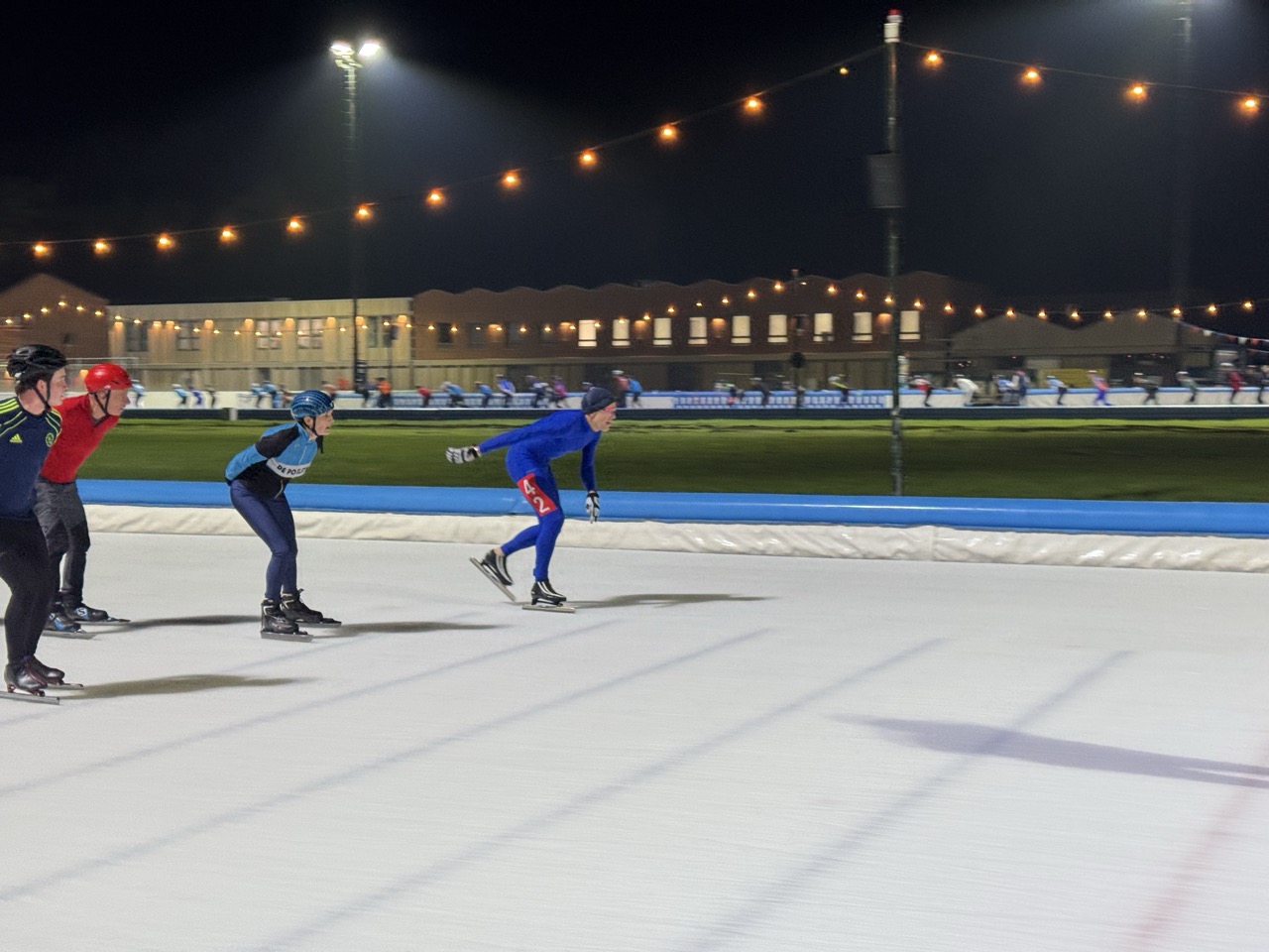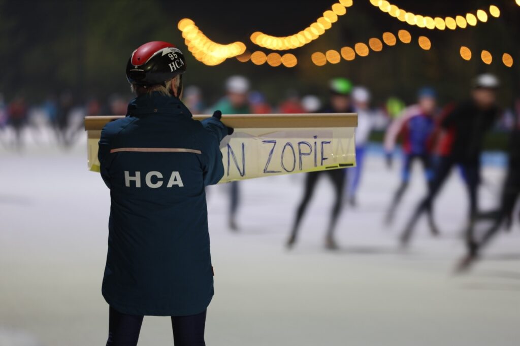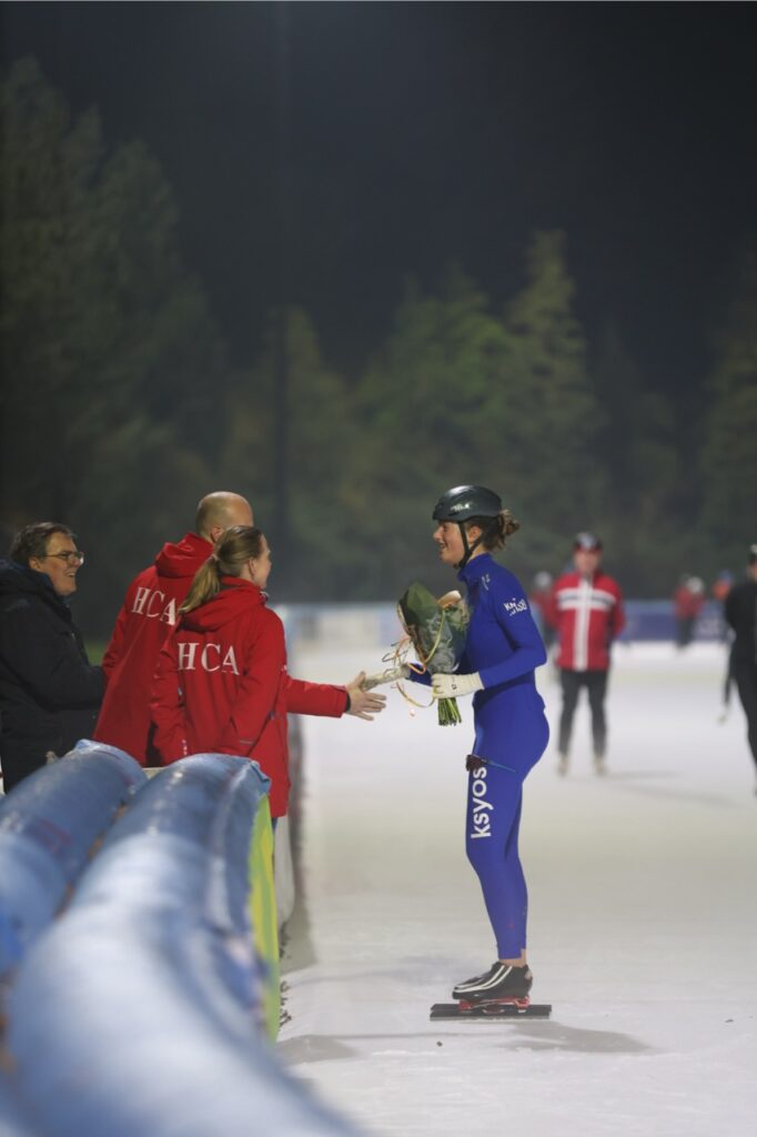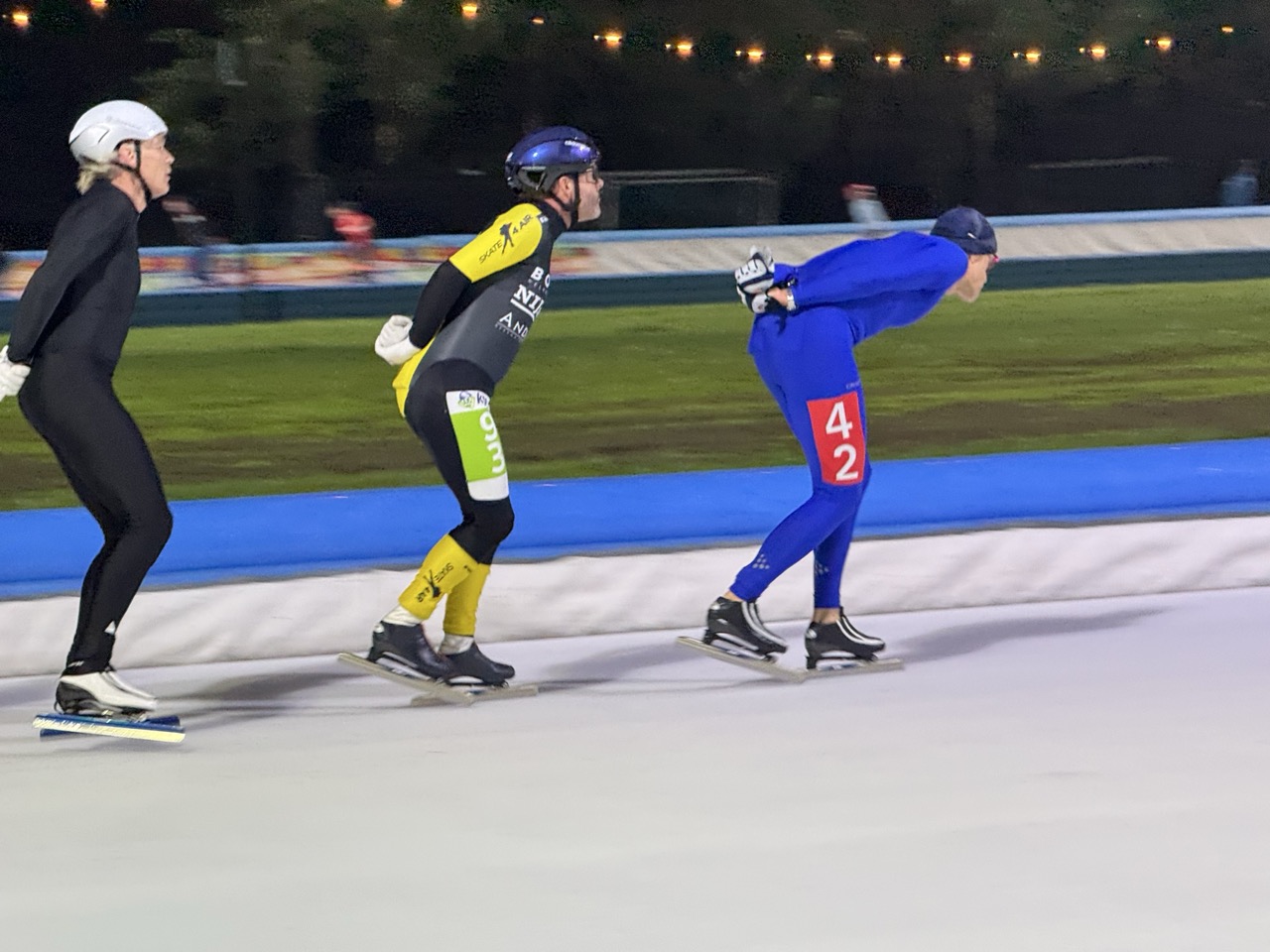 Na de tweede stempelpost op 33 ronden hadden de dames een korte stop, maar konden ze een aantal ronden aansluiten bij de kopgroep van de heren. Dat maakt het voor de rondetellers overzichtelijk. Toch lag het tempo van de heren iets hoger, en verloren ze de aansluiting. Gelukkig werden de dames opgevangen in de groep van de schaatsschool. Met nog 2 ronden te gaan voor de heren ging Niels Siemons demarreren en kwam hij uiteindelijk als eerste solo over de finish. Rutger Beekman en Roel Gremmer gingen daarna sprinten om respectievelijk plek 2 en 3, met als gevolg een volledig HCA podium. Na de finish, een mooie bos bloemen voor de winnaar en de nodige fotosessies met de drie heren, hebben zij hun prestatietocht met trots volbracht.