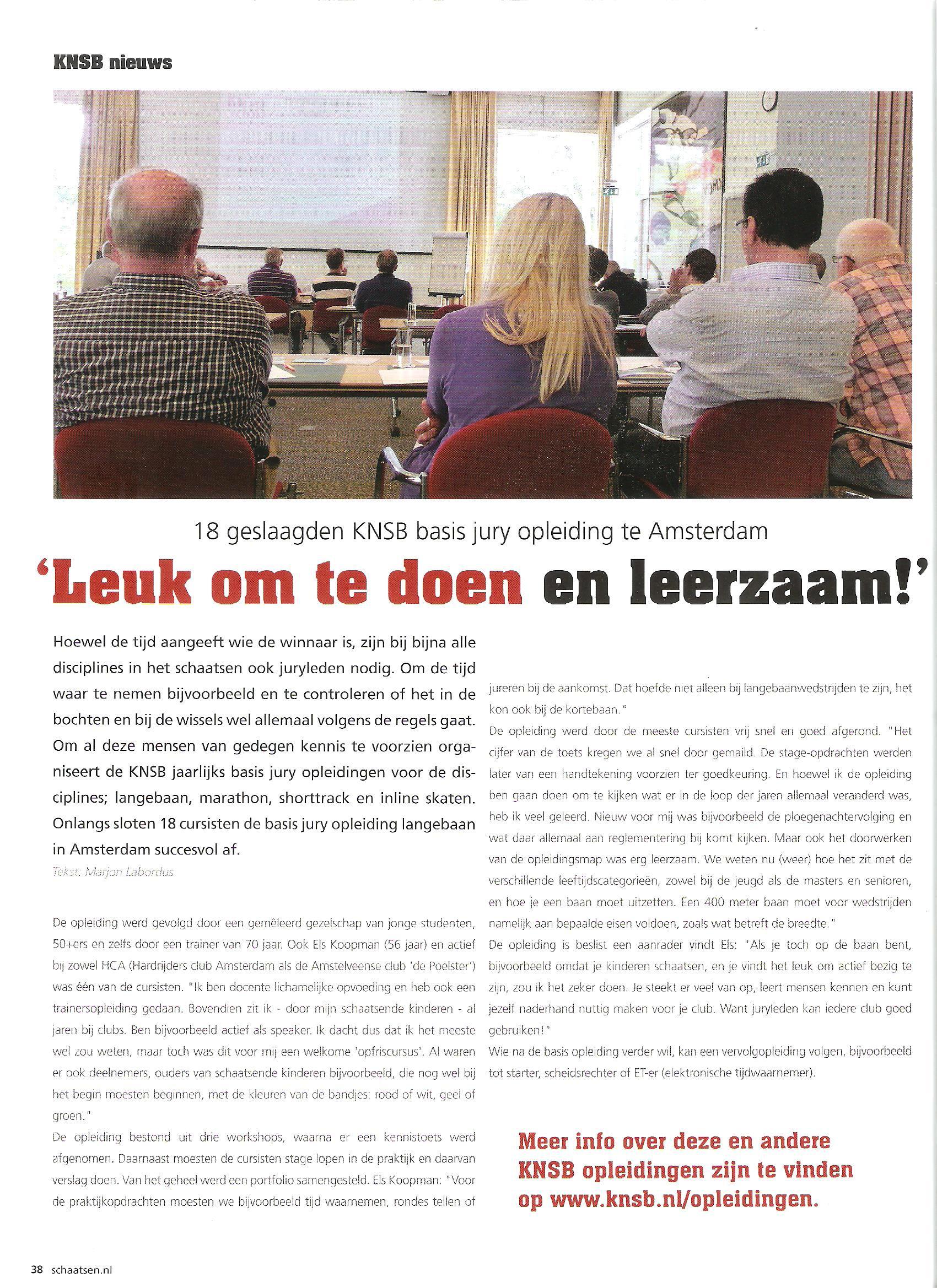 In het meinummer van schaatsen.nl staat een lezenswaardig artikel over de basisjuryopleiding van de KNSB in Amsterdam. Eén van de deelnemers (en natuurlijk geslaagd!) is ons HCA-lid Els Koopman. Els, gefeliciteerd!