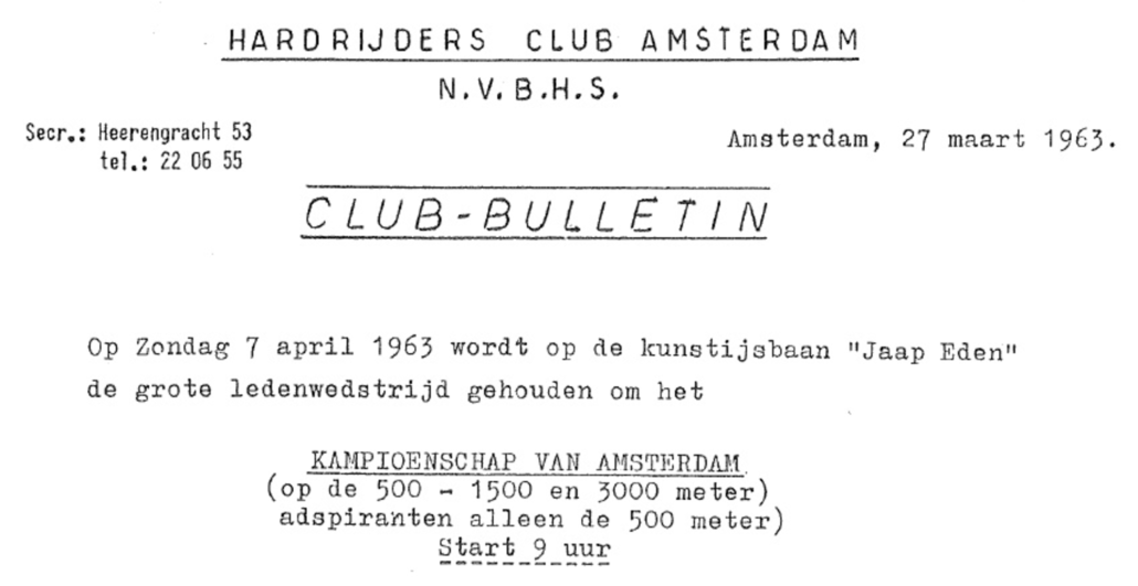 Wij Amsterdammers in de eerste plaats moeten de initiatiefnemers van de Stichting Sportinitiatieven Amsterdam die er voor gezorgd hebben dat er een grote kunstijsbaan aan de Kruislaan komt zeer dankbaar zijn. De Nederlandse Sportfederatie en de gemeente Amsterdam die gelden en terrein etc. beschikbaar stellen mogen we hierbij natuurlijk ook niet vergeten. De totstandkoming der ijsbaan in Amsterdam maakt het voor ons noodzakelijk het beleid ten aanzien van de training te veranderen. Er is besloten vroeger dan anders te beginnen met de z.g. voortraining. Deze zal drie maal per week gehouden worden. In het Amsterdamse bos op zaterdagmiddag en maandagavond. Op woensdagavond in het Barlaeus gymnasium.