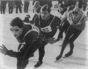Toen ik 15 jaar was en eigenlijk nog bij de kinderen moest rijden, zei mijn vader eens : “Doe jij maar met de mannen mee, dan kan je rijden voor de arme mensen”. Zij kregen dan naar gelang de prijzen waren gevallen, wat levensmiddelen van de club. Ik werd 2e met minimaal verschil tegen een jonge man van 25 jaar. Mijn eerste ervaring met de K.N.S.B. was niet erg plezierig. Ik denk dat het in 1933 was, toen er een wedstrijd op de korte baan, 160 m. dus, werd uitgeschreven door een niet bij de K.N.S.B aangesloten vereniging. Ik werd 1e, en bij de prijsuitreiking zei ik dat ik als amateur van de K.N.S.B. geen geldprijs mocht aannemen, en of zij voor dat geld geen horloge wilden kopen, maar dat ging niet. Later heb ik dat geld toch maar aangenomen, maar ben waarschijnlijk verraden door een donateur van de K.N.S.B. Gevolg: Een schorsing van 5 jaar. Met de schaatsenrijderij op internationaal niveau ging het povertjes. Wij moesten nog altijd teren op de formidabele prestaties van de kampioenen als Jaap Eden en Coen de Koning. In 1929 nam men toen het bewonderingswaardige initiatief tot het oprichten van de Nederlandse Vereniging tot Bevordering van het Hardrijden op de Schaats. Er kwamen meer gerichte droog- en ijstrainingen, met als gevolg verbeteringen van de prestaties op internationaal gebied. Ik noem slechts enkele namen: Broekman, van de Voort, Huiskes en Maarse. De Noren zeiden toen dat de hegemonie zich aan het verplaatsen was. Direkt na de oprichting werd een drie weekse reis naar Oslo georganiseerd. Ja, dat kostte, schrik niet, fl 135,-, reis en verblijf inbegrepen. De reis werd per trein gemaakt (De trein niet vernield). Op het ijs waren wij helemaal op ons zelf aangewezen. In het begin hadden wij geen trainer en moesten het zien te leren van het kijken naar de Noren. Als wij ’s avonds gingen trainen, want dan waren er de meeste Noren, kwam ook wel eens Oscar Mathiessen op de baan. De legendarische oud wereldkampioen gaf ons dan nog wat adviezen.